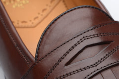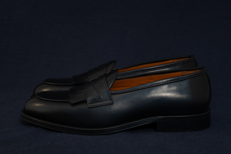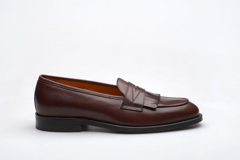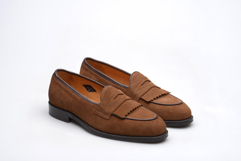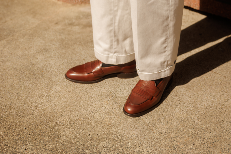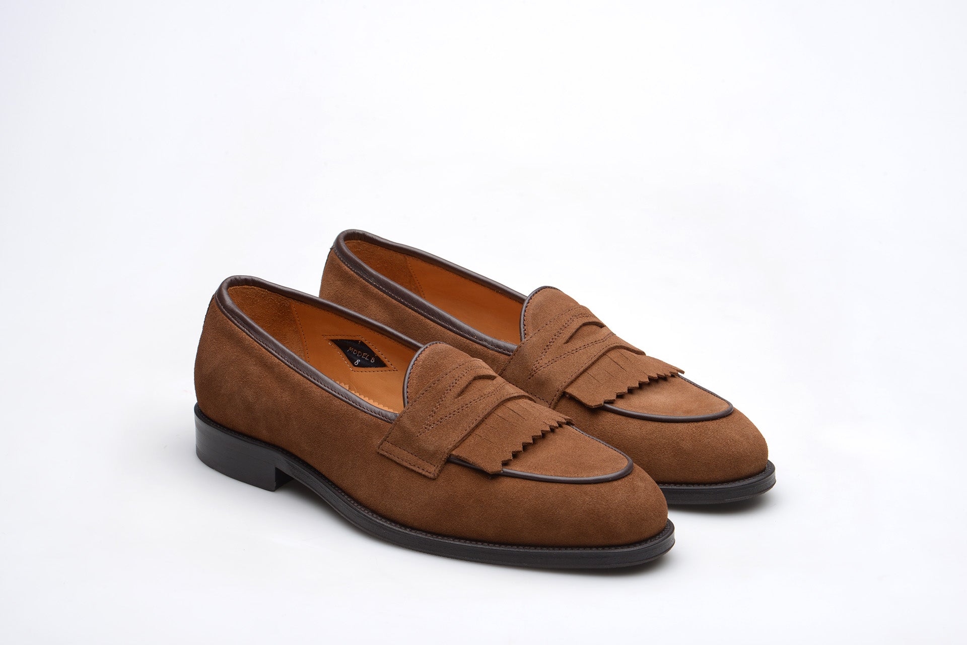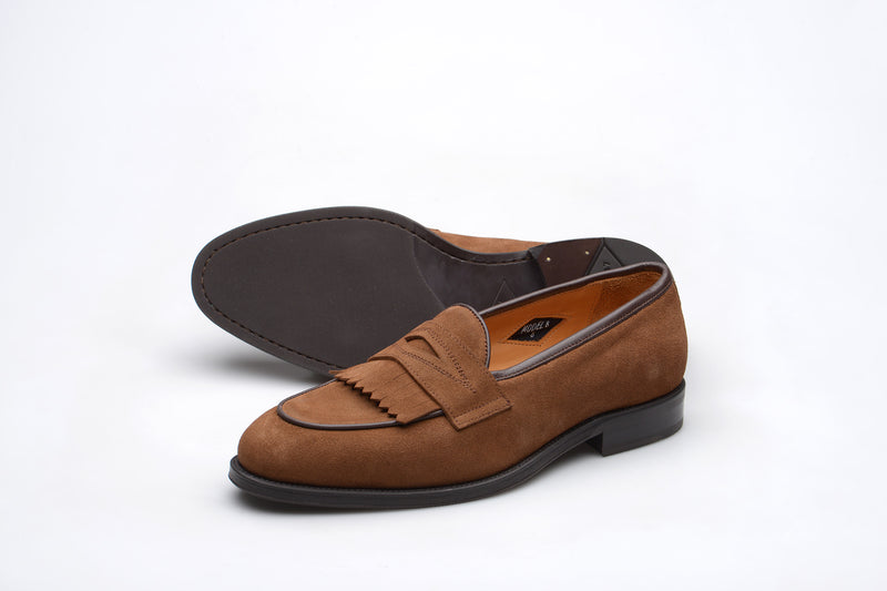 The Wildsmith Model 8 is inspired by our original Model 98 design which we have updated by lowering the vamp height and changing the corded vamp to a subtle piped apron. We have kept the iconic diamond saddle while adding a fringe (or kiltie) to the design, which is inspired by old Scottish golfing shoes. Together these changes create a more casual feel. Model 8 is on a rubber sole and is on our bestselling WILD 1 last, which is a classic English loafer last.