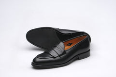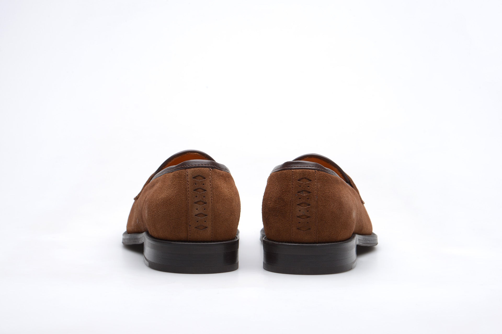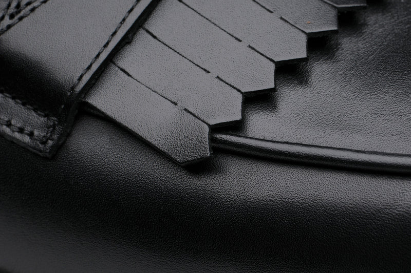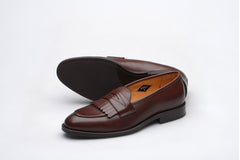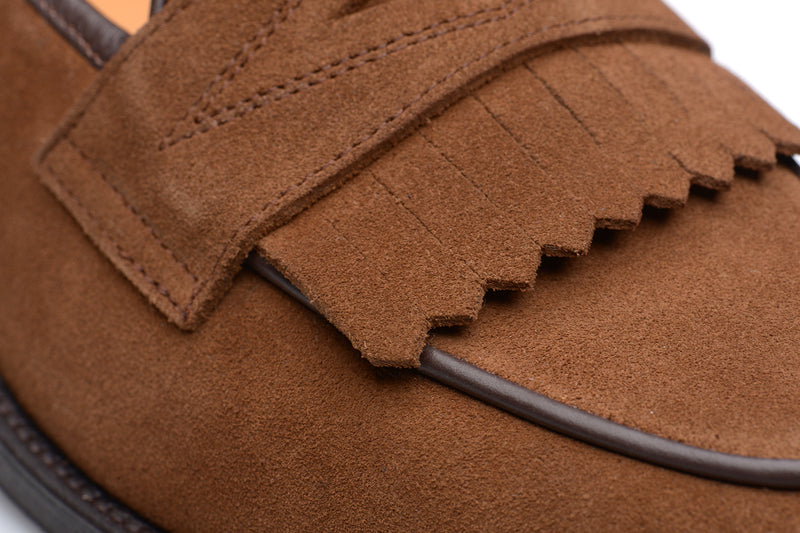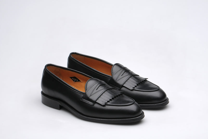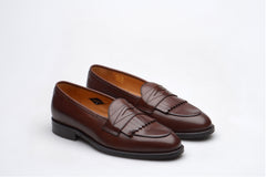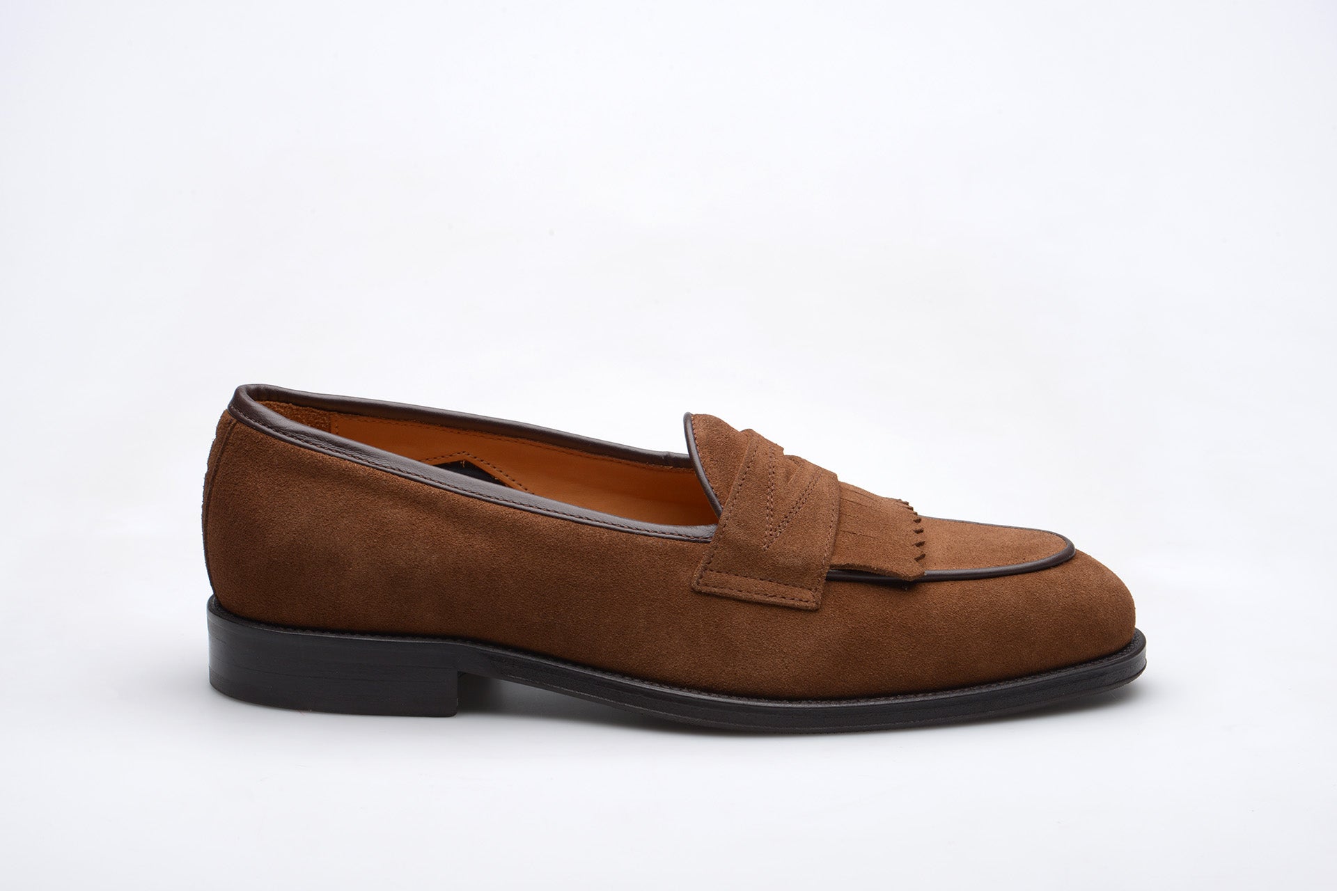 The Wildsmith Model 8 is inspired by our original Model 98 design which we have updated by lowering the vamp height and changing the corded vamp to a subtle piped apron. We have kept the iconic diamond saddle while adding a fringe (or kiltie) to the design, which is inspired by old Scottish golfing shoes. Together these changes create a more casual feel. Model 8 is on a rubber sole and is on our bestselling WILD 1 last, which is a classic English loafer last.