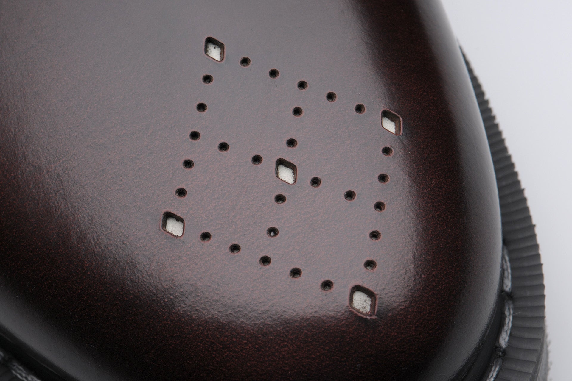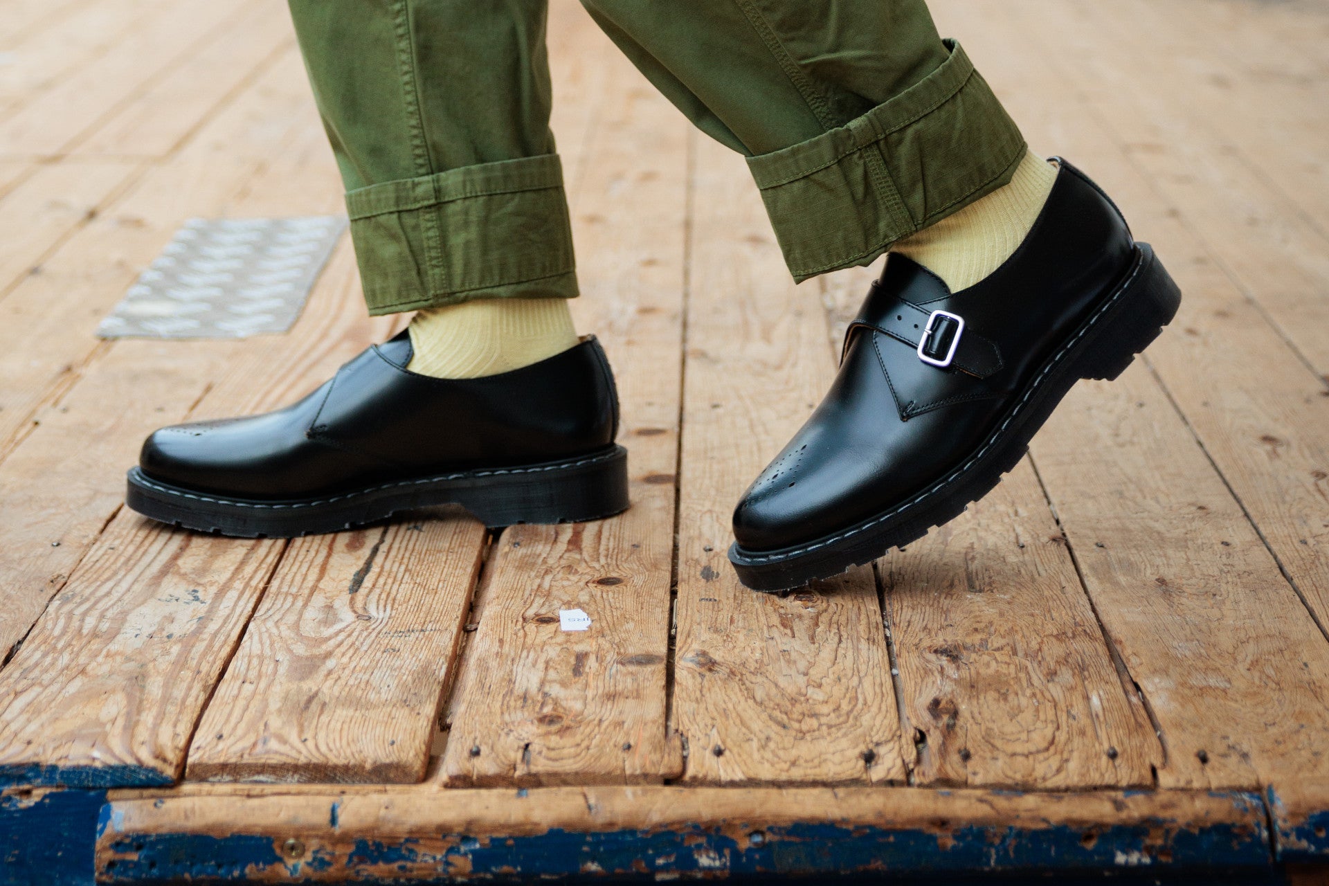 Available in burgundy rub-off with a contrasting off-white underlay for depth and texture, or black hi-shine, a staple in the Solovair archive.